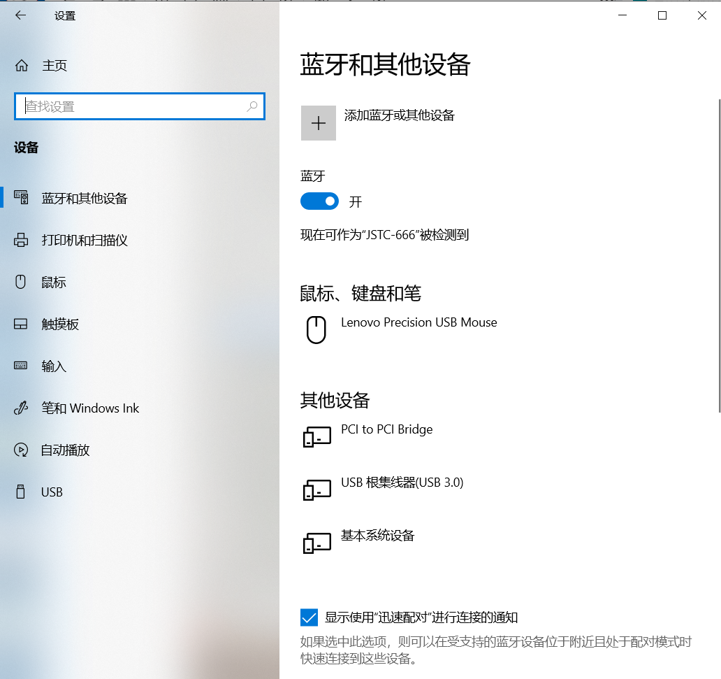 在“Windows 设置”窗口单击“设备”命令,打开“设备”设置窗口。可以在该窗口设置系统蓝牙和其他设备、打印机和扫描仪、鼠标、键盘、触摸板等。如下图所示。