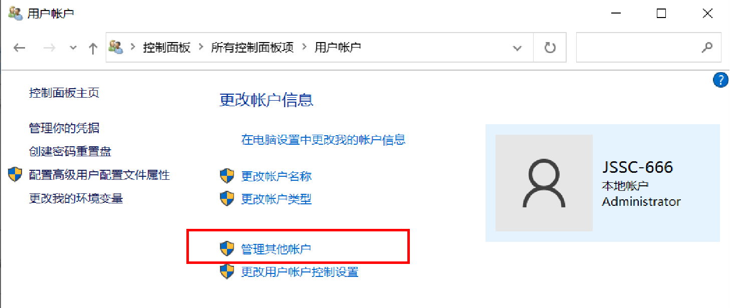 ① 在“控制面板”窗口单击“用户账户”,在打开的“用户账户”窗口中选择“用户账户”,打开“用户账户”窗口,单击“管理其他账户”文字链接。