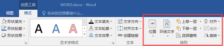 在“绘图工具”选项卡的“排列”命令组中,可通过“位置”、“环绕文字”、“对齐”和“旋转”等对文本框的位置、文字环绕方式、对齐方式等进行设置。