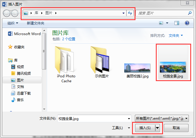 将鼠标定位在文档中需要插入图片的位置处,单击“插入”→ “插图”命令组→ “图片”按钮,在弹出的“插入图片”对话框中,选择需要插入的图片文件,单击“插入”按钮,即可在指定位置处插入图片。
