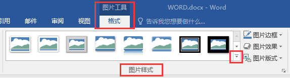 选中插入的图片,单击“图片”选项卡的“图片样式”组的其他按钮,在样式列表中,将鼠标停留在某个样式上,会出现样式名称,点击某样式,即可将图片设置成相应的样式。