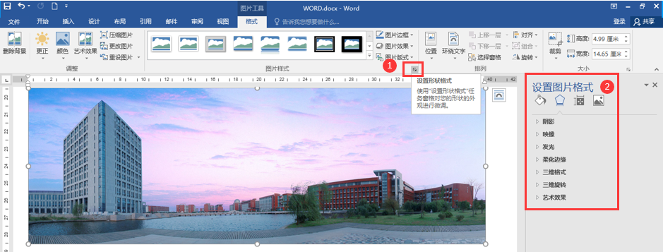若单击“图片样式”组右侧的“设置形状格式”按钮,或在图片上单击鼠标右键,在Word窗口的右侧会出现“设置图片格式”窗格,可对图片的格式进行更详细的修改。主要包括:图片的填充与线条、图片的效果、图片格式等。