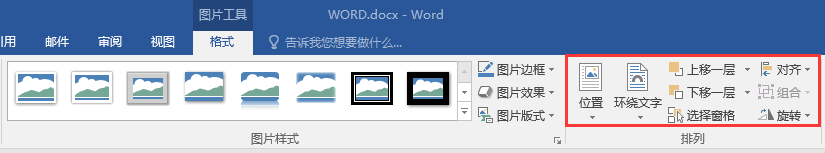 选中插入的图片,在“图片”选项卡的“排列”命令组中,可以设置图片在页面中的显示位置、文字环绕图片的方式、多张图片的叠放顺序、图片的对齐方式及旋转角度等。