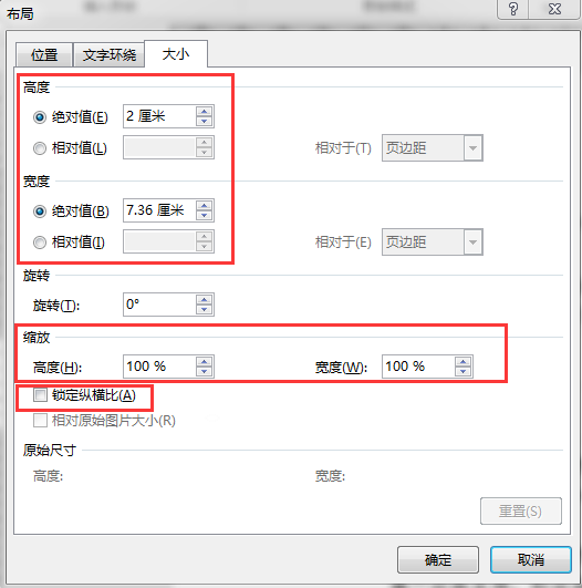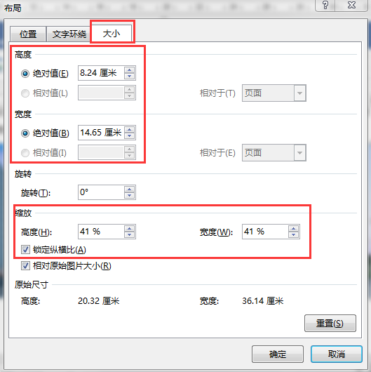选中插入的图片,在“图片”选项卡的“大小”命令组中,可具体地修改图片的高度、宽度数值。也通过单击“大小和位置”命令组右侧的对话框启动器或在图片上点击鼠标右键选择“大小和位置”命令, 打开“布局”对话框,对图片进行缩放比例设置或大小设置。