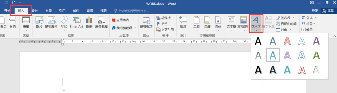 2)也可先选中已输入的文本内容,单击“插入”→“文本”命令组→“艺术字”命令下拉列表中的“某种艺术字样式,即可在文档中直接创建艺术字。