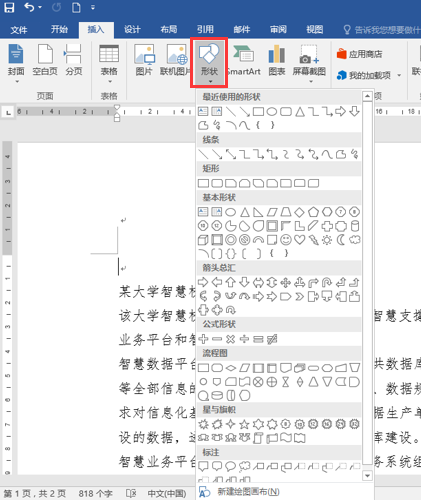 单击“插入”→“插图”命令组→“形状”命令,在下拉列表中会出现各种类型的形状。单击任一形状,鼠标的光标会变成十字形,按下鼠标左键并拖动鼠标即可画出所需的形状。如果要画正方形或正圆形,可以选择矩形形状或椭圆形状,按住【Shift】键不放,拖动鼠标即可。