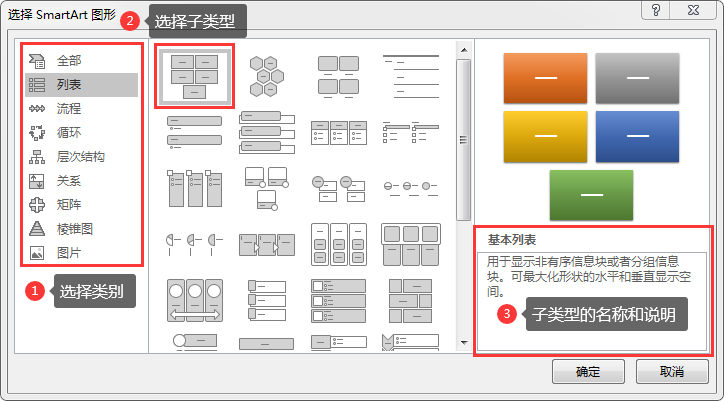 (1)单击“插入”→“插图”命令组 → SmartArt命令,在弹出的“选择SmartArt图形”对话框中,选择“流程”类型中的“步骤上移流程”, 单击“确定”按钮,即可在文档中插入SmartArt图形。