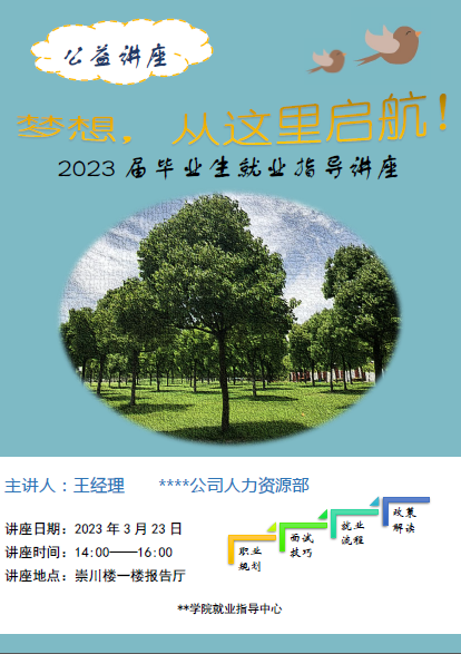 牛刀小试2:参考样张(图2-2-4),在文档上方插入文本框,输入“2023届毕业生就业指导讲座”,另在文档下方插入文本框,参考样张输入文字,并按要求对文本框及文字进行格式设置。