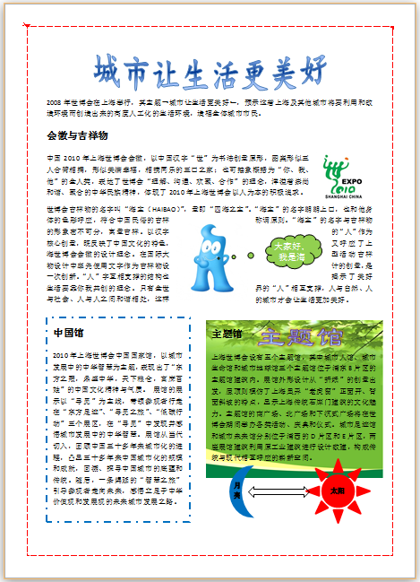 (6)将中国馆和主题馆两大标题段的内容置于文本框,设置左文本框为2.25磅、蓝色、划线-点的边框,高度和宽度分别为10厘米、7厘米,右文本框设置无线条,拖动适当调整文本框宽度和高度,使得文字能全部显示。