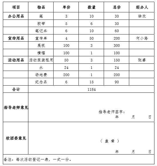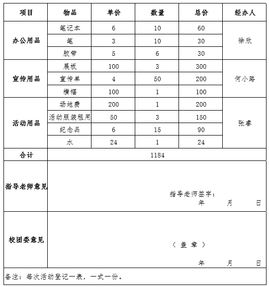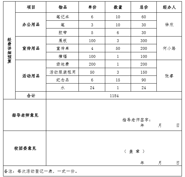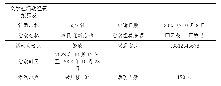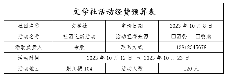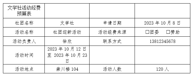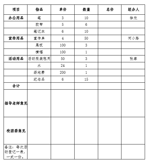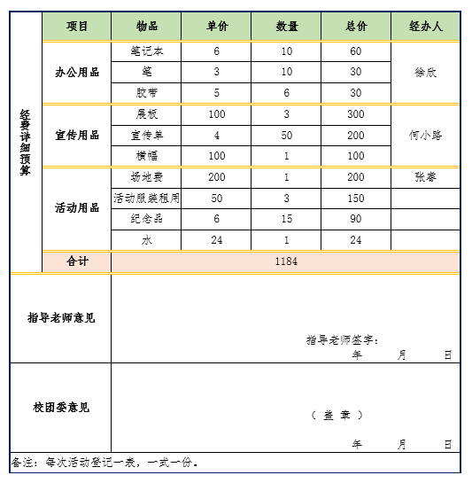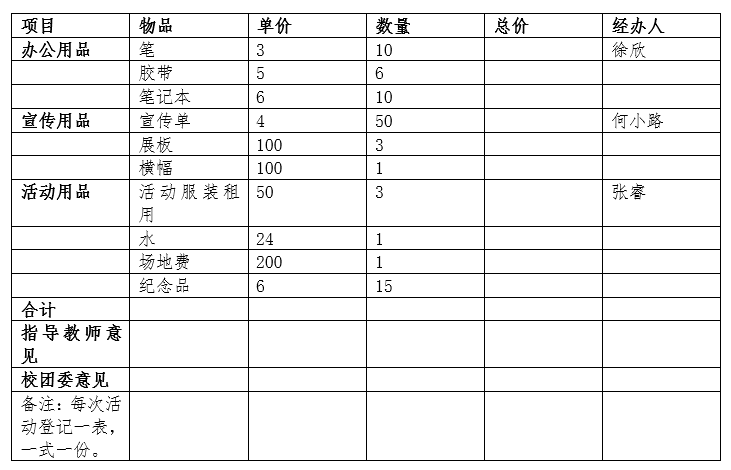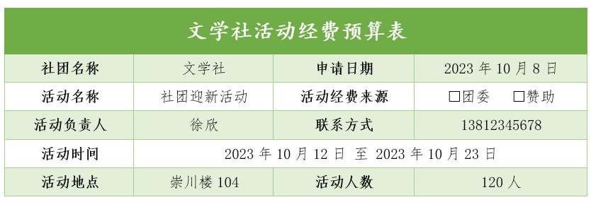 小徐是学校文学社社长,又是一年开学季,随着即将开始的各项迎新活动,需要制作一份社团活动经费预算表。小徐同学目前仅整理出了活动各项预算支出,但绞尽脑汁还是没有做出一张简洁、有条理的预算表。如何制作一份清晰明了又美观的预算表呢?让我们一起来帮小徐同学完成这个任务吧!