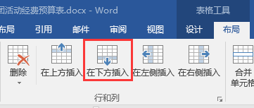 (2)选中横线下方表格的后四行,单击“表格工具 ”→“布局 ”选项卡→“行和列”命令组,选择“在下方插入”(图2),根据样张输入文本内容。