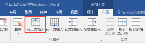 (1)将鼠标定位在上方表格第一行内的任一单元格中,单击“表格工具 ”→“布局 ”选项卡→“行和列”命令组,选择“在上方插入”(图1),根据样张输入第一行内的文本。