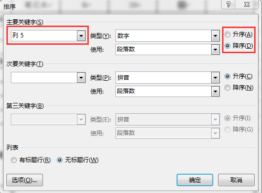 (1)选中“办公用品”类对应的三行数据,单击“表格工具 ”→“布局 ”选项卡→“数据”命令组→ “排序”命令(图1),在弹出的“排序”对话框(图2)中,设置排序“主要关键字”为“列5”,排序方式为“降序”。同样的方法,分别对“宣传用品”和“活动用品”类物品进行排序。