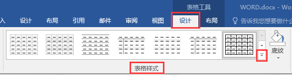 操作方法为:将鼠标置于表格内任一单元格,单击“表格工具 ”→“设计”选项卡→“表格样式”命令组的“其他”按钮,在下拉样式列表中,选择某一样式即可。