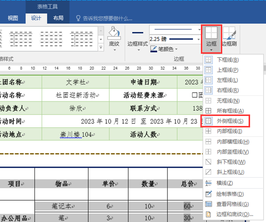 (1)选中整个表格,在“表格工具 ”→“设计”选项卡→“边框”命令组中,设置“笔划粗细”为2.25磅,“笔颜色”为深蓝色(图1),在“边框类型”下拉列表中选择“外侧框线”(图2)。