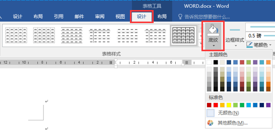 选中整个表格或表格的部分单元格区域,单击“表格工具 ”→“设计”选项卡→“表格样式”命令组→ “底纹”命令,选择底纹颜色即可。