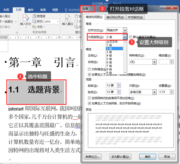 在创建目录之前,要确保文档中的标题使用了适当级别的标题样式,如章节标题、子章节标题等。若没有设置级别,可选中标题,点击鼠标右键,选择“段落”命令,或单击“段落”命令组右侧的对话框启动器,打开“段落”对话框,在“大纲级别”后的下拉列表中选择相应的级别,如图2-4-5所示。