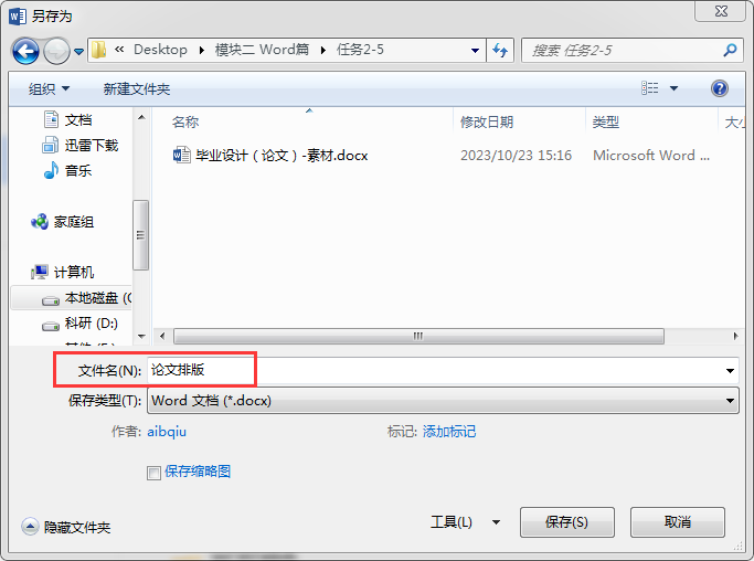 (1)打开文档“毕业论文素材.docx”,单击“文件”→“另存为”→“浏览”,在“另存为”对话框中输入文件名“论文排版”(图1),单击“确定”。