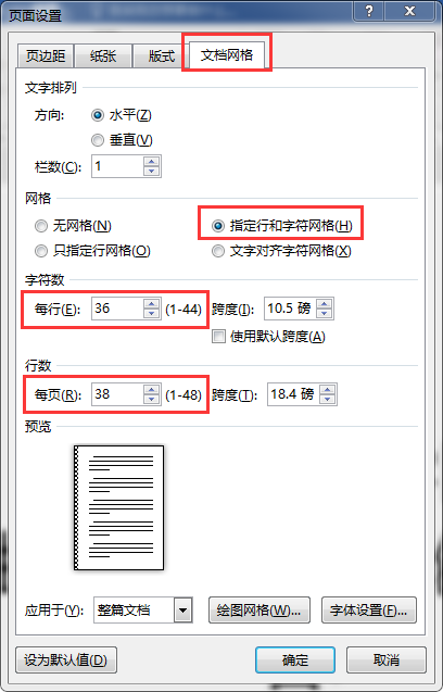 操作要求:设置纸张大小宽度为18.5厘米,高度为26.5厘米,上、下、左、右边距均为2.5厘米,装订线在左边1厘米,并设置每行36字、每页38行。