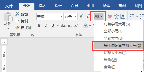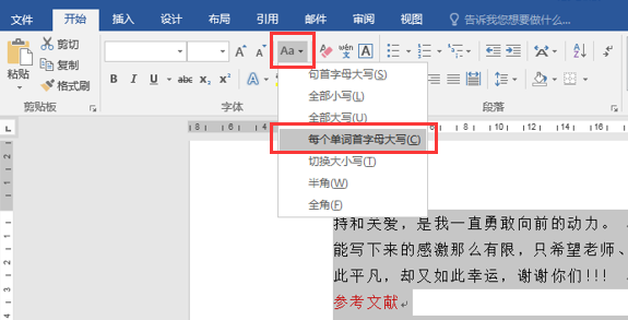 (1)选中中文摘要和关键词部分内容,单击“开始”→“字体”命令组→“更改大小写”命令(图1),选择“每个单词首字母大写”命令,将所有单词改为大写。