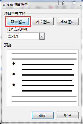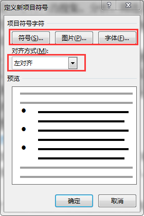 2)在下拉列表的项目符号库中选择某一符号或单击“定义新项目符号”,在弹出的“定义新项目符号”对话框中可单击“符号”或“图片”按钮,选择新的符号或图片作为项目符号,若单击“字体”按钮可为项目符号设置字体格式(项目符号的字体格式也可选中项目符号,在“开始”→“字体”命令组中设置 ),单击对齐方式下拉列表,可设置项目符号的对齐方式。
