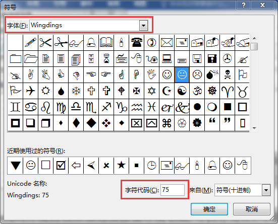(2)在弹出的“符号”对话框(图3)中,选择“字体”为“Wingdings”,“字符代码”框内输入“75”,单击“确定”按钮。效果如图4所示。
