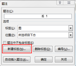 (3)在打开的“题注”对话框(图2)中,点击“新建标签”按钮(图3),在弹出的“新建标签”对话框中输入新的标签内容(图4)。当标签内容确定后,在“题注”下方会显示当前题注效果,单击“位置”右侧下拉列表,选择“在所选项目下方”,如图5所示。