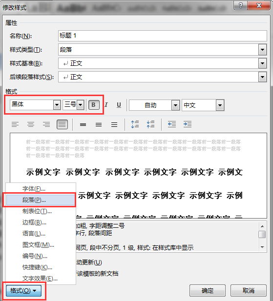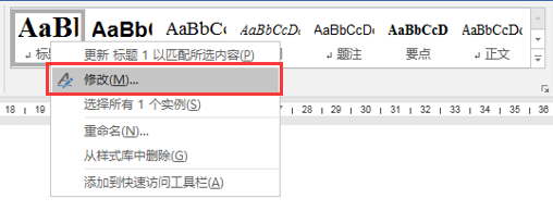 若需要对样式进行修改,可在某样式上单击鼠标右键,选择“修改”命令,或单击“样式”窗格中的某个样式右侧的下拉按钮,在下拉列表中选择“修改”命令;在弹出的“修改样式”对话框中按需要对样式进行修改。