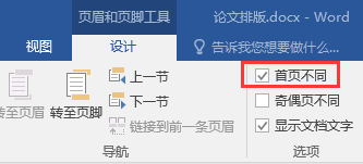 ①将鼠标置于封面页上方页眉位置处,双击鼠标左键,进入“页眉和页脚”编辑状态,勾选“页眉和页脚”选项卡下的“首页不同”