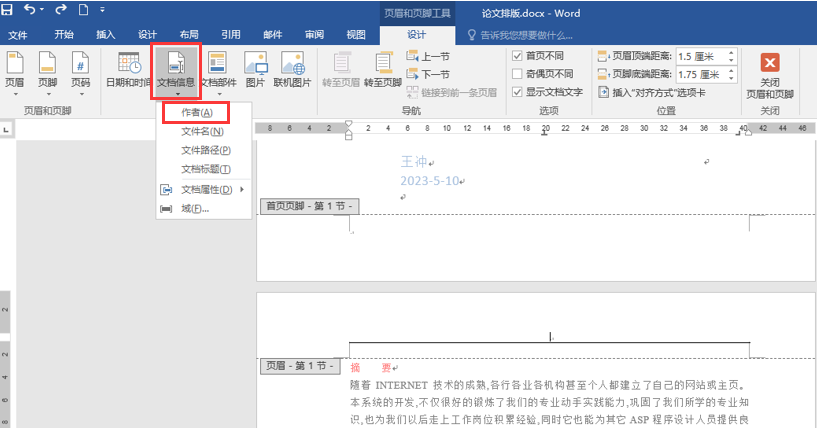 ②将鼠标定位在第2节“摘要”页上方的页眉处,单击“页眉和页脚”→“插入”命令组→“文档信息”命令,在下拉列表中选择“作者”(图1),第2节的页眉即为作者姓名。