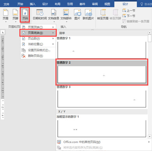 ③将鼠标定位在第2节“摘要”页下方的页脚处,单击“页眉和页脚”选项卡→“页眉和页脚”命令组→“页码”命令,在下拉列表中选择“页面底端”→“普通数字2”格式的页码,如图2所示,删去页码下方的回车符。继续在“页码”下拉列表中选择“页码格式”命令(图3),在打开的“页码格式”对话框中按要求选择“编号格式”和“起始页码”(图4)。