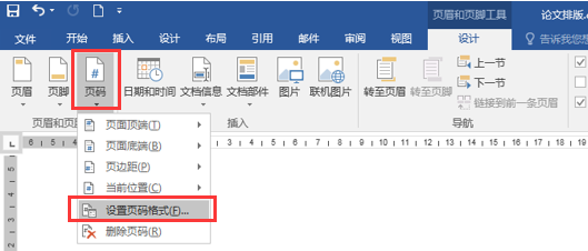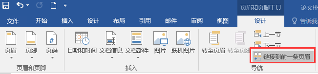 ④将鼠标定位在第3节“第一章”页面上方的页眉处, 先单击“页眉和页脚”选项卡→“导航”命令组中的“链接到前一条页眉”命令(图5),使其处于不被选中的状态,再将鼠标定位在页脚位置,同第③步中的方法插入页码,并设置页码格式如图6所示。