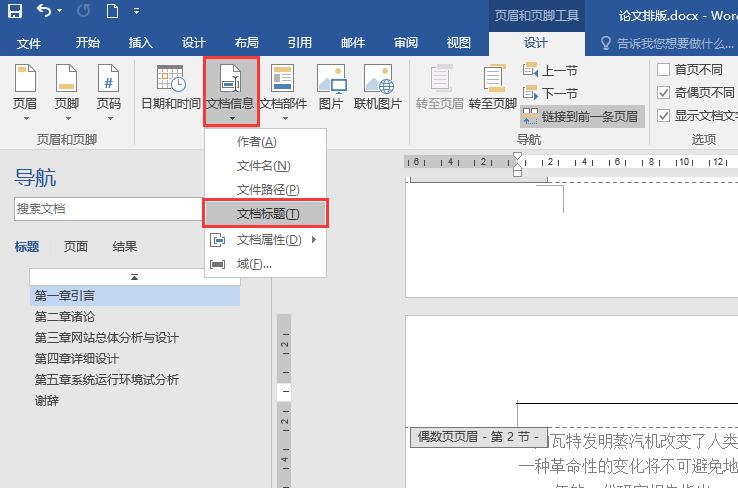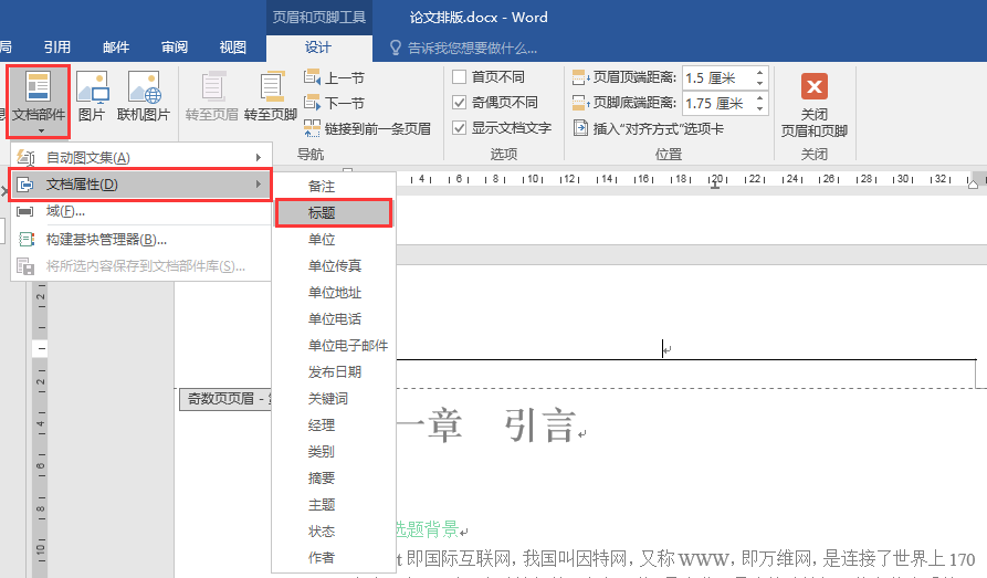 ⑤将鼠标定位在第3节“第一章”页面上方的页眉处, 勾选“页眉和页脚”选项卡→“选项”命令组中的“奇偶页不同”,此时该节左上角会出现“偶数页页眉-第3节”,滑动鼠标将其定位在奇数页面的页眉处,单击“页眉和页脚”选项卡→“插入”命令组→ “文档部件”命令(图7),在下拉列表中选择“文档属性”→“标题”(图8),或单击“页眉和页脚”选项卡→“插入”命令组→ “文档信息”命令,在下拉列表中选择“文档标题”(图9)。所有奇数页将会插入在“文档属性”中设置的标题内容(图10)。