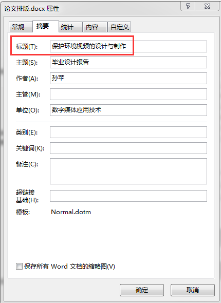 (1)将鼠标置于正文任意处,选择“文件”菜单→ “信息” → “属性”下拉按钮→ “高级属性”命令,打开“文档属性”对话,进入“摘要”选项界面,可分别设置文档的标题、主题、作者等信息。