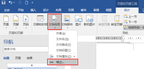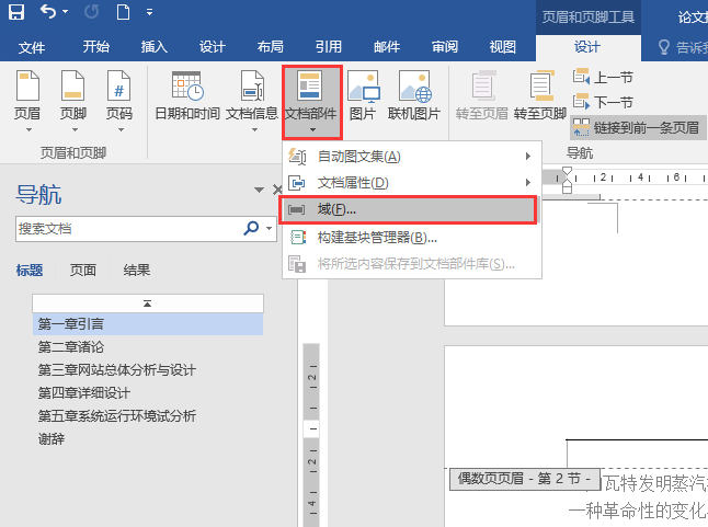 ⑥滑动鼠标至下一页,页面左上角显示“偶数页页眉-第3节”,将鼠标定位在页眉处,单击“页眉和页脚”选项卡→“插入”命令组→ “文档部件”命令,在下拉列表中选择“域”(图11),或单击“页眉和页脚”选项卡→“插入”命令组→ “文档信息”命令,在下拉列表中选择“域”(图12),在“域”对话框中,在“类别”下拉列表中选择“StyleRef”,在“样式名”列表中选择本论文所有章节标题的样式“标题1”,单击“确定”按钮即可。