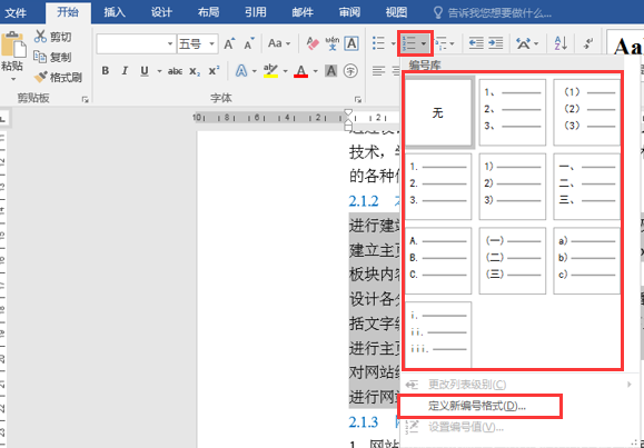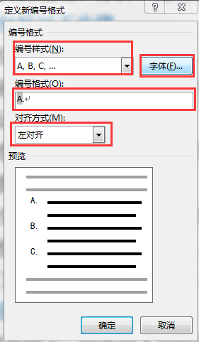 2)在下拉列表的编号库中选择某一编号或单击“定义新编号格式”,在弹出的“定义新编号格式”对话框中,单击“编号样式”再下拉列表中选择某种编号,也可在“编号格式”下的框内对已有的编号进行修改。若单击“字体”按钮可为项目编号设置字体格式(项目编号的字体格式也可选中项目符号,在“开始”→“字体”命令组中设置 ),单击对齐方式下拉列表,可设置项目编号的对齐方式。
