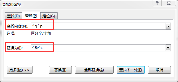 (2)按下【Ctrl】+【A】全选,单击“开始”→“编辑”命令组→“替换”命令,在弹出的“查找和替换”对话框中,“查找内容”后的框内输入“^g^P”,“替换为”后的框内输入“^&^c”(在所有对象下方插入题注),点击“全部替换”按钮。