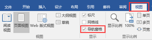 当文档中设置好不同大纲级别的标题样式后,单击“视图”→“显示”命令组,勾选“导航窗格”,在左侧导航窗格中通过点击不同的章节名称可快速定位至相应章节, 便于用户浏览文档。