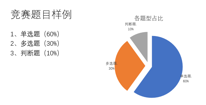 操作要求:根据第六张幻灯片左栏中题目类型和所占的百分比在右栏插入饼图;图表标题:各题型占比;不显示图例;数据标签在外,显示“类别名称”和“值”,设置饼图的分离程度为10%;设置图表样式为:样式5;图表高度:11厘米,宽度:10厘米;移动图表到合适位置。