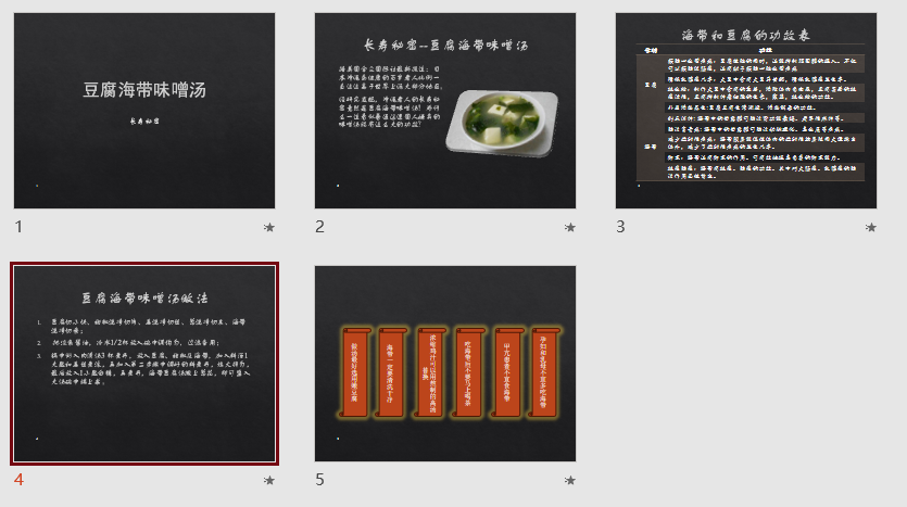 (5)在第一张幻灯片前插入版式为“标题幻灯片”的新幻灯片,主标题为“豆腐海带味噌汤”,副标题为“长寿秘密”,主标题设置为黑体、49磅字,副标题为22磅字;幻灯片的页脚内容为“1”。