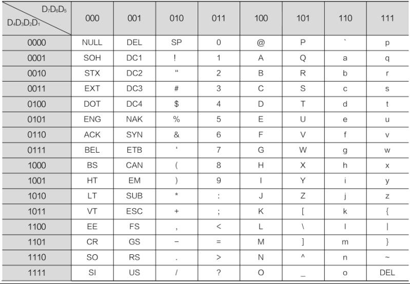 每个字符用一个7位二进制数表示,一个字节8位,最高位D7为0,具体编码对照如图5-4-3所示。