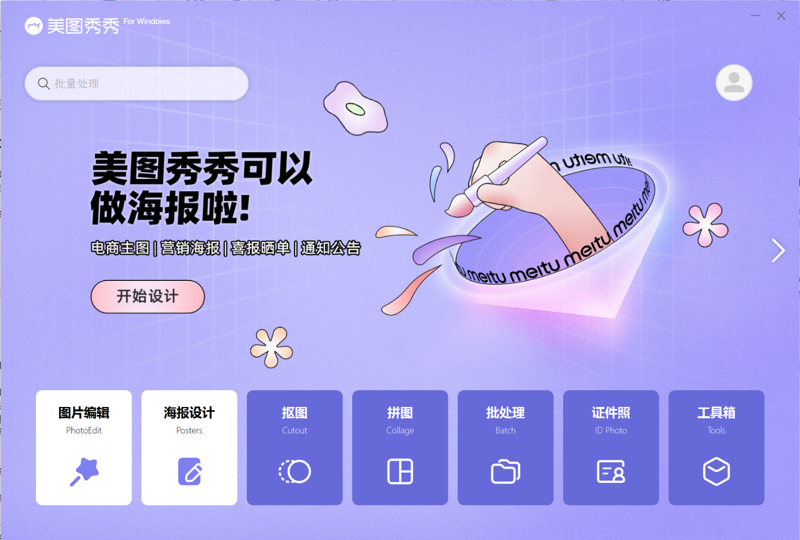 美图秀秀是一款易使用、且免费的图片处理软件。拥有图片编辑、海报设计、抠图、拼图,批处理、证件照等功能,软件界面如图6-3-1所示。