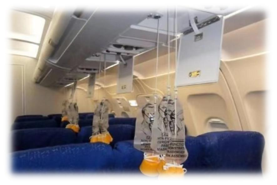 众所周知,随着高度的增加,空气逐渐稀薄,空气中含氧量也随之减少,人就会感到缺氧。因此,遇到客舱突然失压或其他缺氧情况时,机上的氧气面罩可防止人体高空缺氧,确保机上全体人员的生命安全。当座舱高度达到 14000 英尺时,氧气面罩储藏箱的门自动打开,氧气面罩会自动脱落。