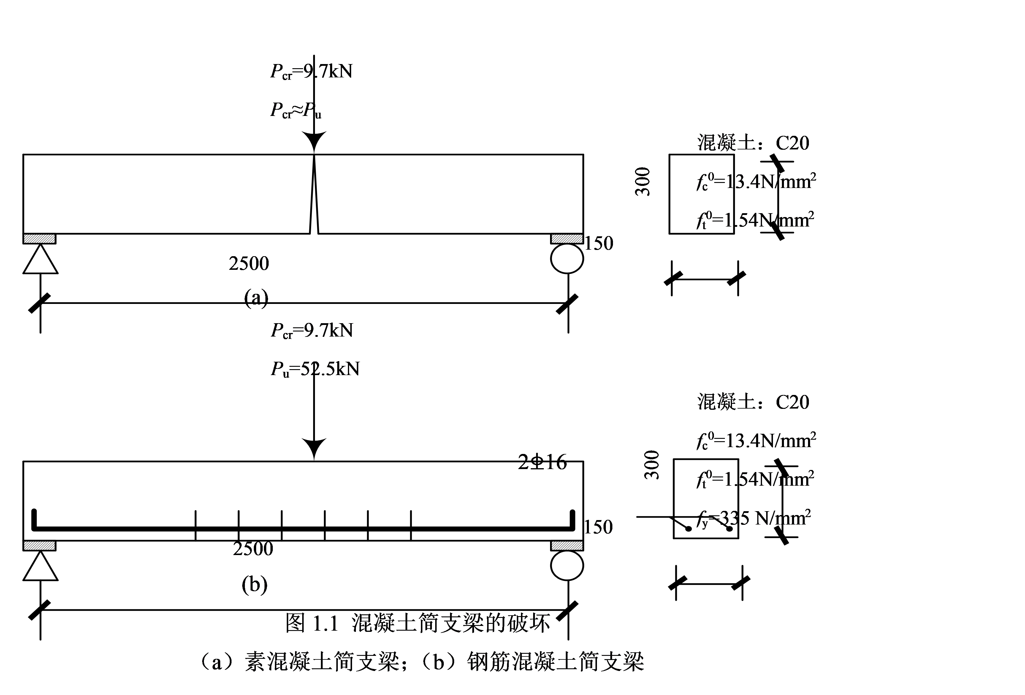 图1.1(b)所示钢筋混凝土梁是与图1.1(a)素混凝土梁的截面尺寸、跨度、混凝土强度等均相同,只是在受拉区配置了2B16钢筋。梁开裂前与素混凝土梁类似,开裂荷载Pcr亦为9.7kN,但受拉区混凝土开裂后,拉力由钢筋承担,荷载可以继续增加,直至钢筋屈服,此时的荷载Py=50kN。梁在屈服荷载以后,变形仍可持续增大,最后因受压区混凝土被压碎而达到极限荷载Pu=52.5kN。