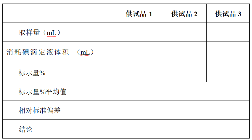 3 滴与水适量使成 1000m1,摇匀,用垂熔玻璃滤器滤过。 (注:在定量分析中, 滴定液应进行标定,由于碘滴定液在标定中用到的基准物为三氧化二砷,是毒品, 需通过严格的审批手续才能购买,而且要上锁防盗保管,不方便处理,这里就省 去标定过程。)