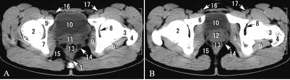 下图为经耻骨体(A)和耻骨上支(B)的横断层CT(男),请写出图中数字标注的结构