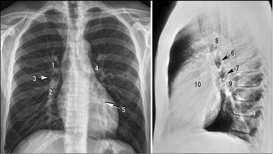 二、熟悉肺门、肺裂、肺叶和肺段的影像学特点,掌握肋膈角、心膈角和奇食隐窝的影像学特点。掌握胸腔器官的常用体表投影。