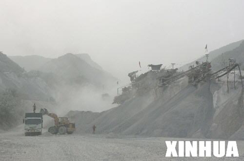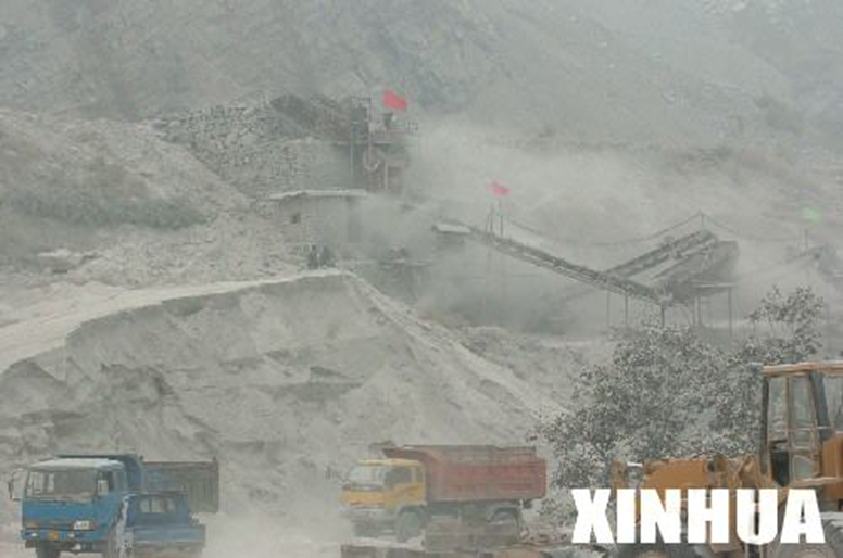 一建在山腰的砂石料加工企业内尘土飞扬,遮天蔽日