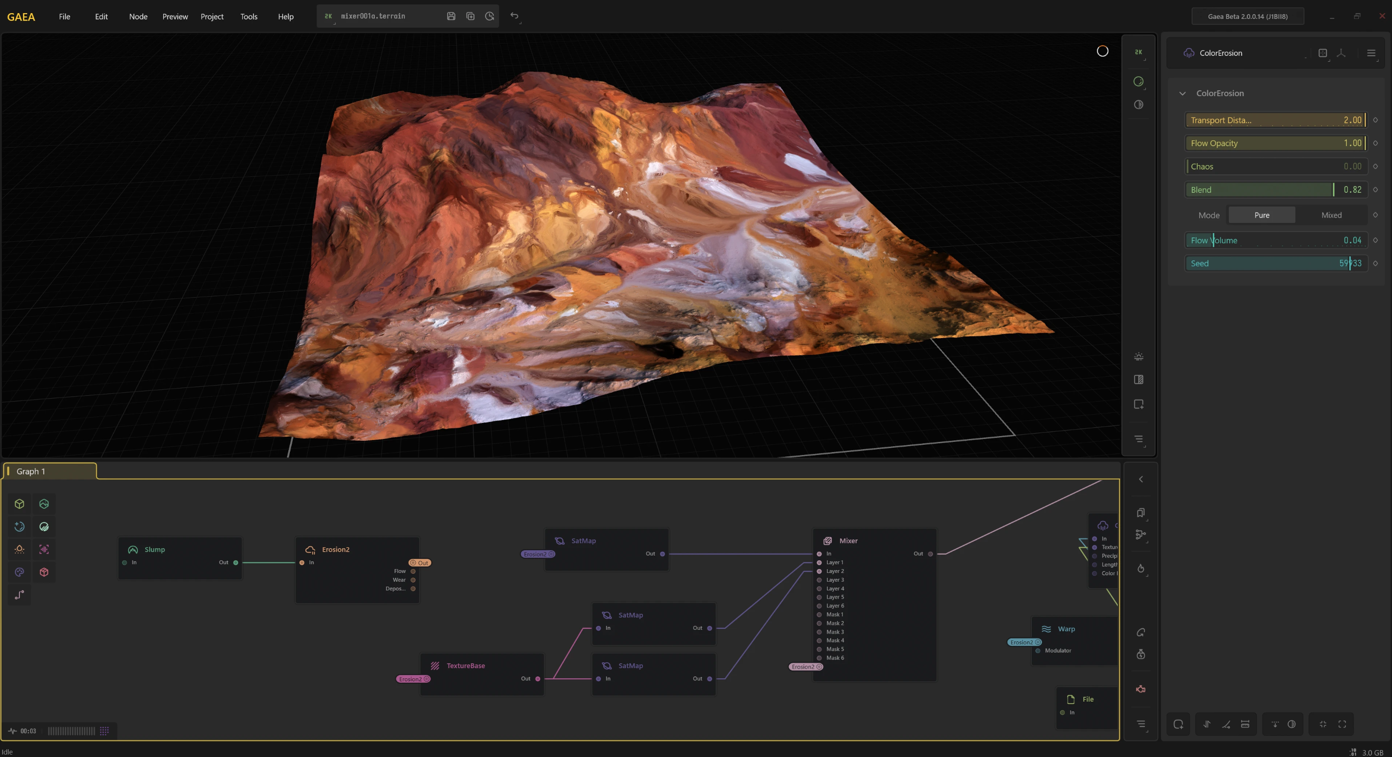 色彩和材质:调整地形的色彩和应用材质,以增加视觉效果。虽然Gaea主要关注地形形状的生成,但也可以通过调整色彩来模拟不同的环境和地质。
