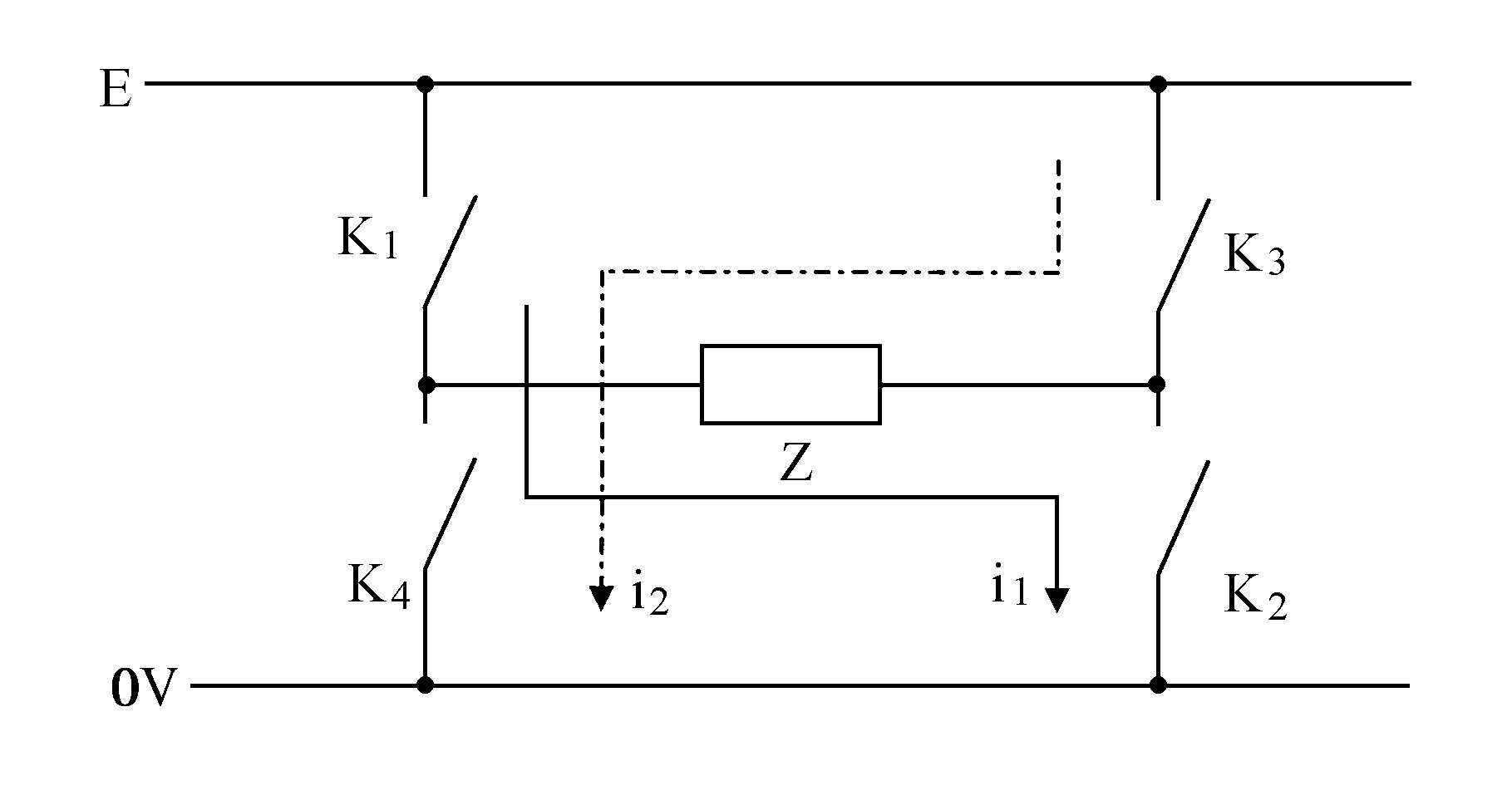 t3时间段:K1、K2断开,K3、K4闭合,电流为i2,Z上电压为-E。